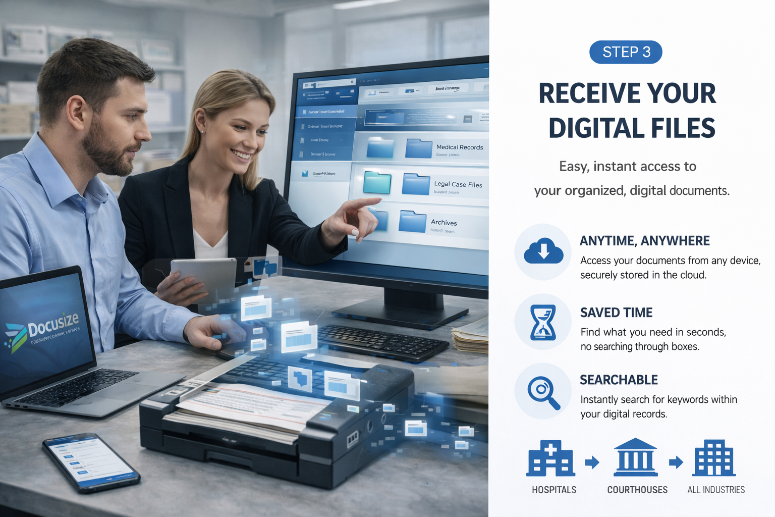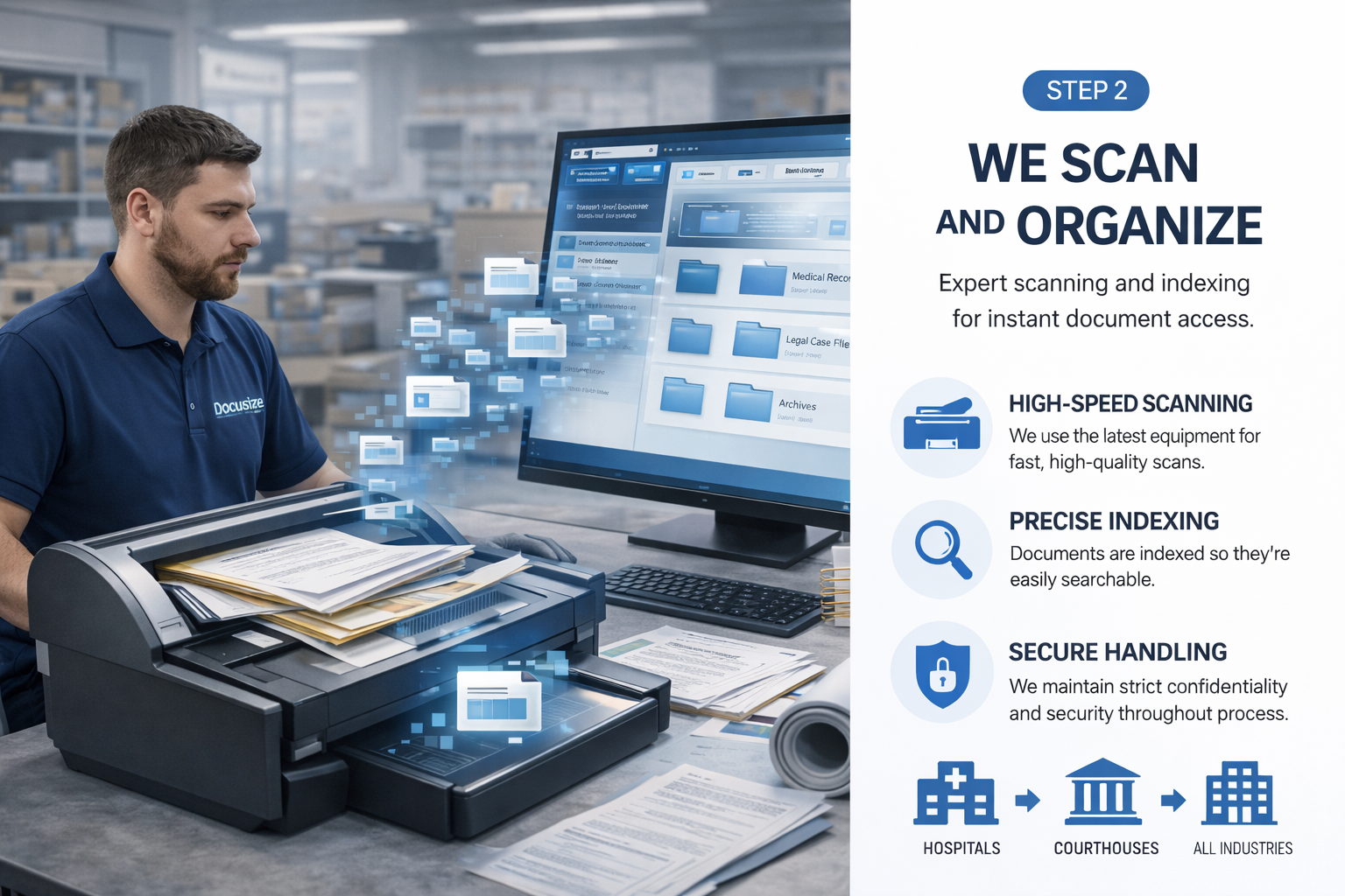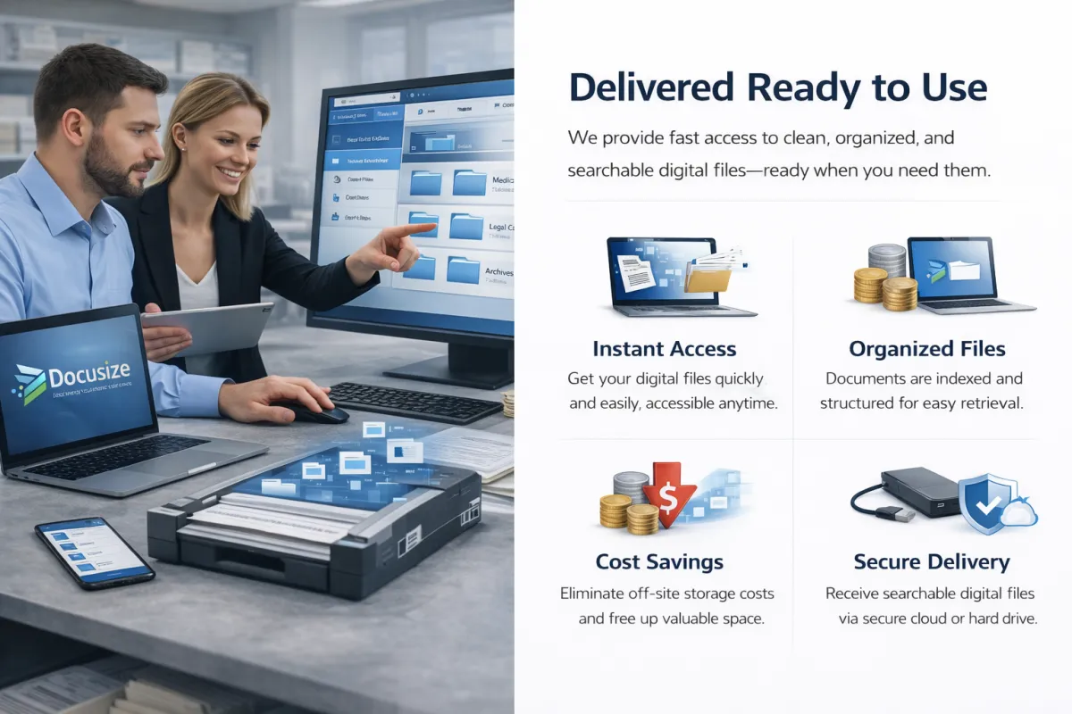Docusize helps businesses eliminate documents, reduce storage costs, and improve access to critical information through reliable, high-volume document scanning.